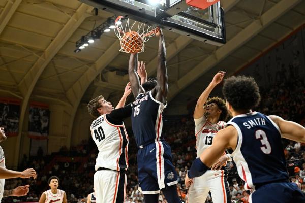 Ike’s layup made it 65-51 with 7:55 remaining. After Josiah Lake II buried a 3-pointer for the Beavers, Davis Fogle scored on a putback, Ike converted a three-point play and Mario Saint-Supery connected on a trey to give the Zags a 73-54 advantage with 4:48 left.